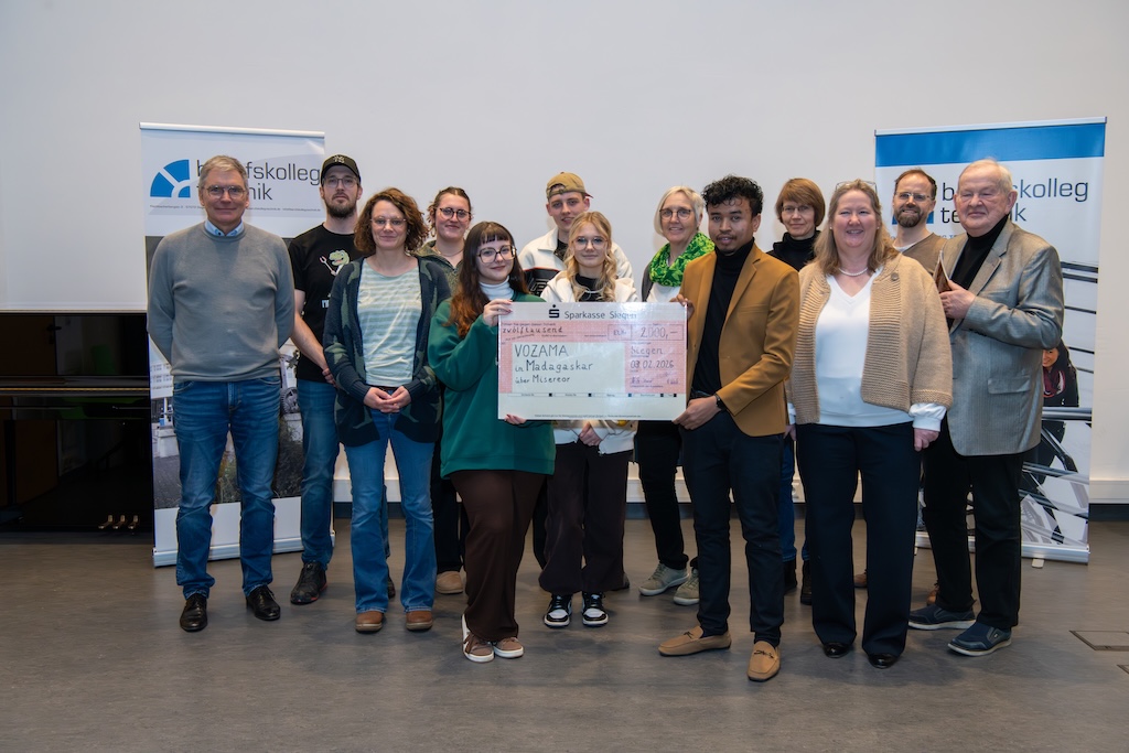 Stolze 12.000 Euro konnten im Januar 2026 an Misereor für VOZAMA in Madagaskar überwiesen werden. Joel Hajarivelo, ehemaliger Schüler des Berufskollegs Technik, und Mitglieder des Eine-Welt-Kreises Weidenau nahmen stellvertretend den Scheck von der SV entgegen.